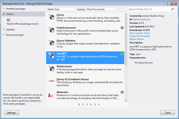 In order to deserialize Json results into our generated classes, we need to use another 3rd party tool named Json.NET. To add a reference to this library, we can perform either of 2 methods: